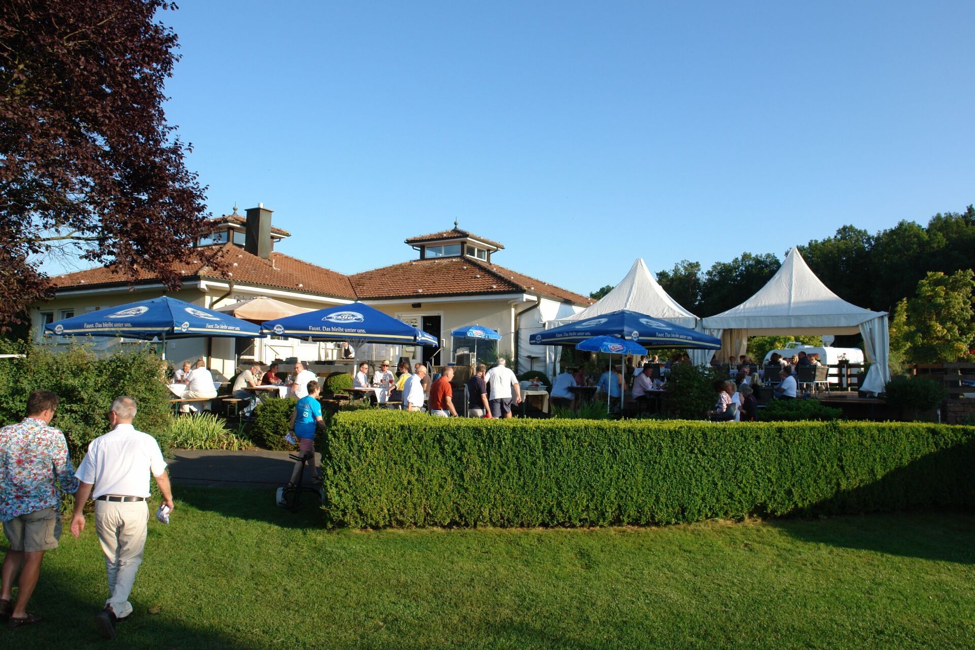 Nach den ersten gespielten 9 Loch gab es am Clubhaus eine Stärkung in Form von Weißwürsten mit Brezeln und einem erfrischenden kühlen Getränk. Die bis dahin gespielten Scores wurden schon mal diskutiert und erste Spekulationen, wer am Ende vorne liegen könnte, angestellt.
